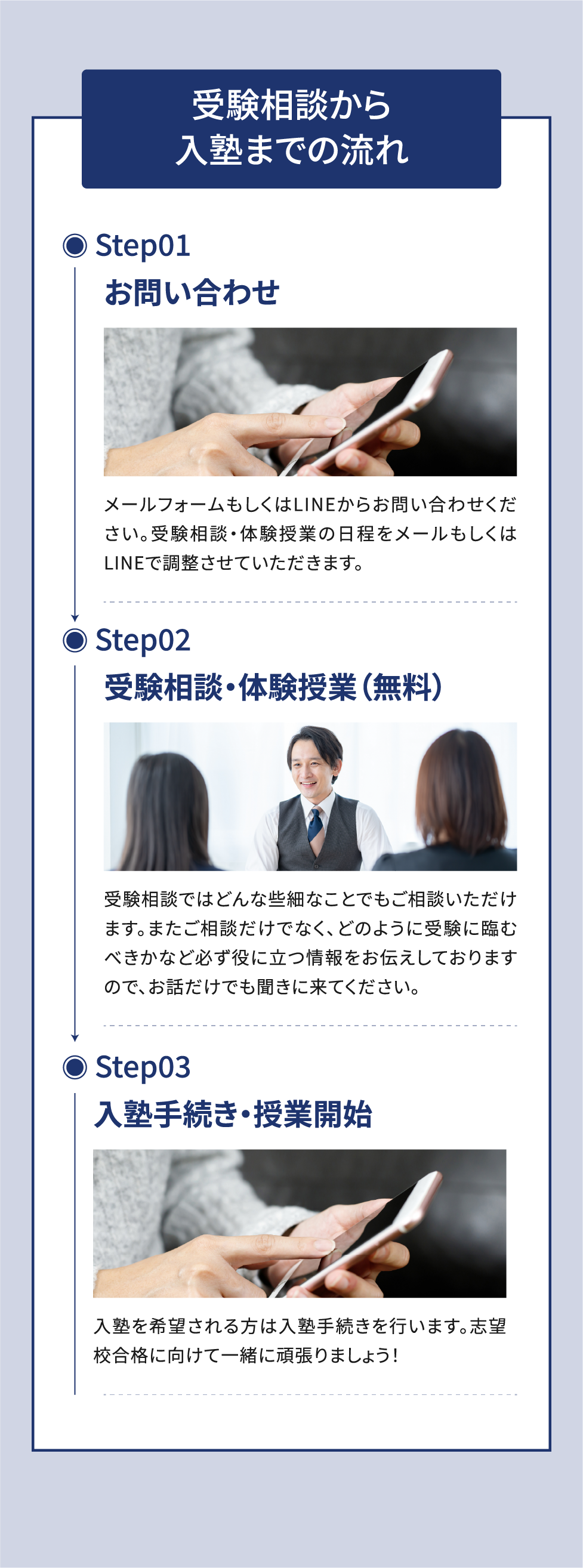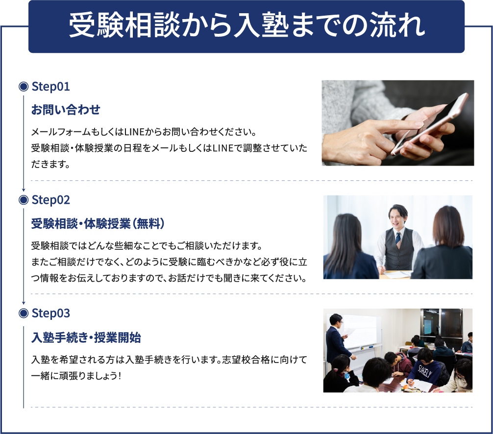 A. まだまだ間に合います!4月から入塾される方も多く、遅い方であれば7月の方もいらっしゃいます。ただ1日でも早ければ早いほど受験対策ができ、合格確率は高まります。もし塾に通おうと迷っているのであれば、強引な勧誘や営業はありませんので、受験相談だけでも受けに来ていただければと思います。きっと受験勉強をするにあたって役立つ情報があると思います。