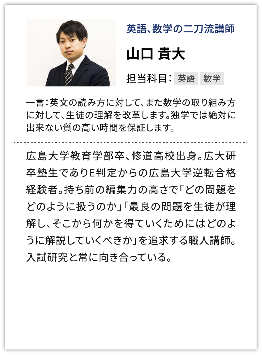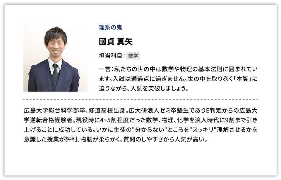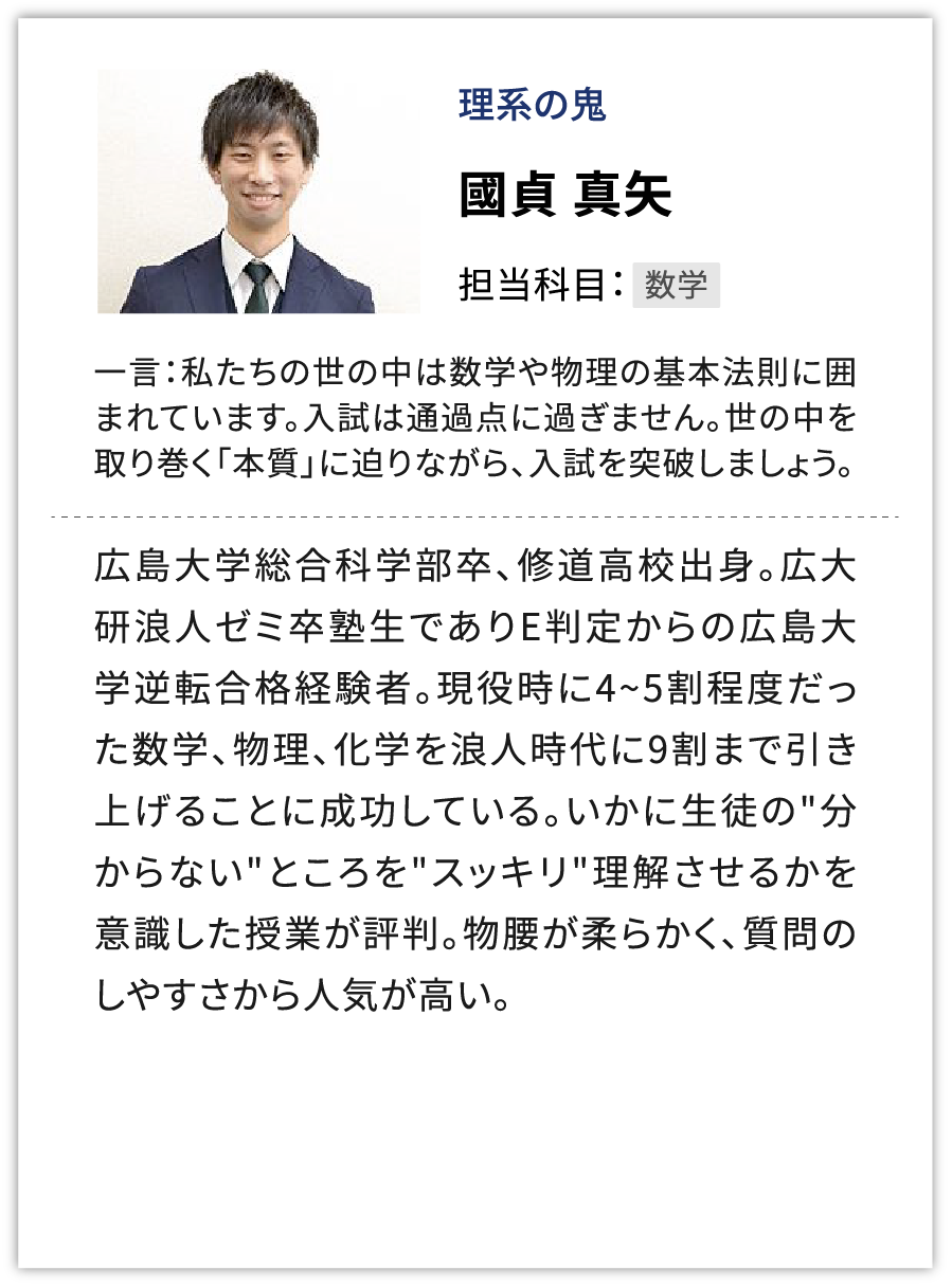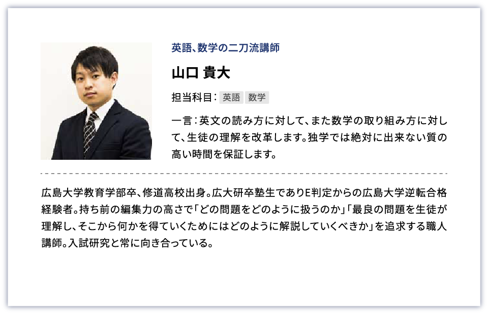 講師陣は広大研独自の厳しい審査を通過した「広島大学合格者」のみで構成されています。講師によって指導のレベルが下がることがなく、一定レベル以上の授業・指導で着実に成績が向上します。