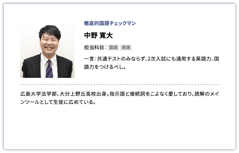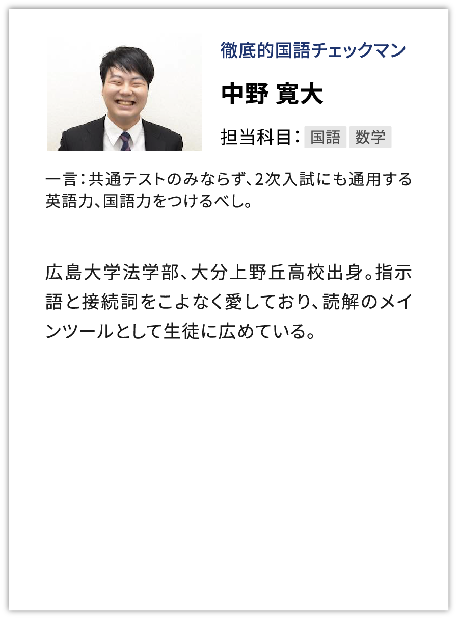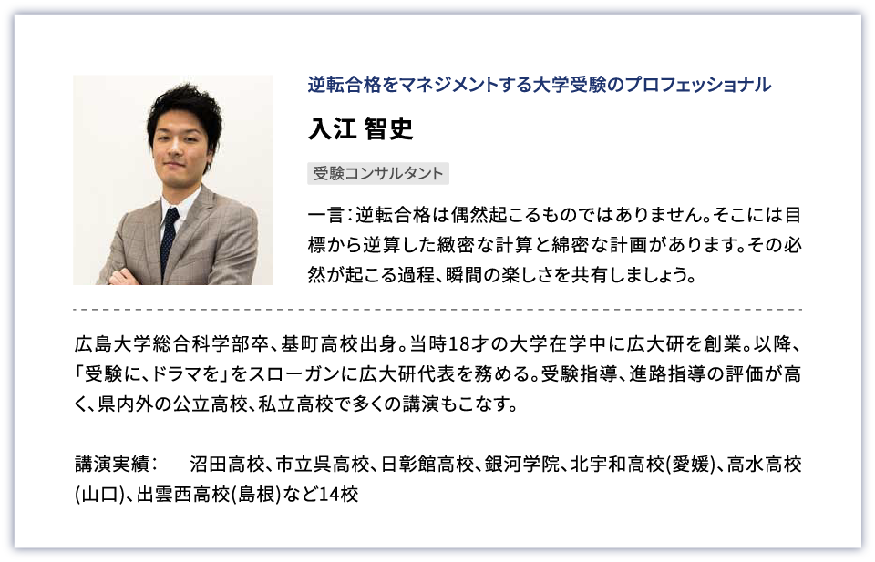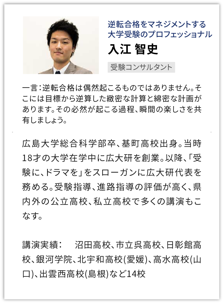 講師陣は広大研独自の厳しい審査を通過した「広島大学合格者」のみで構成されています。講師によって指導のレベルが下がることがなく、一定レベル以上の授業・指導で着実に成績が向上します。